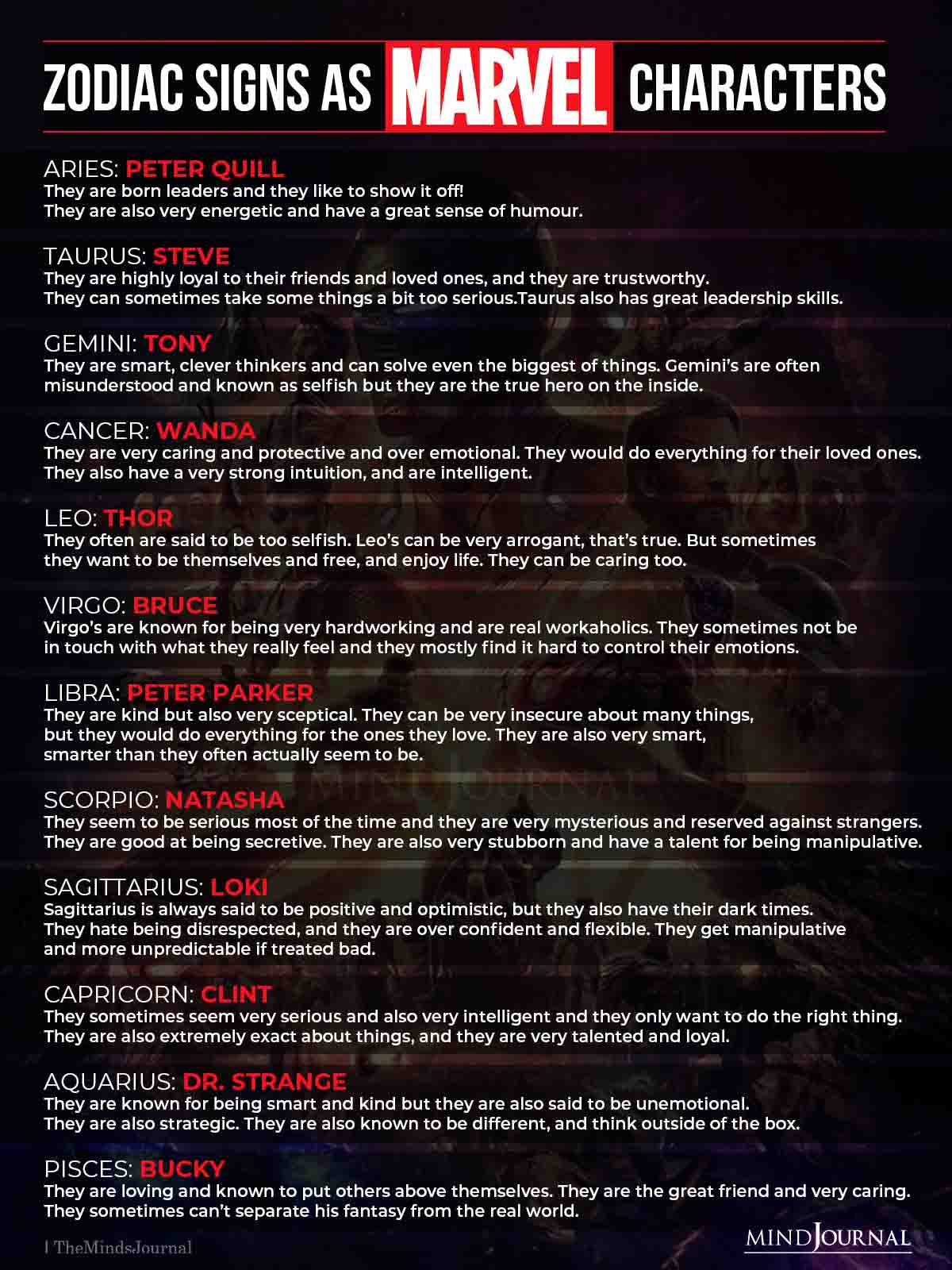 While his Independence Day birthday is on the nose, Cancers are people who like to take care of others and have a strong sense of loyalty, which translates to Cap's arc in the MCU, which started with his devotion to his country. Capricorn isn't an unfriendly sign, just an incredibly hard-working one. This is very in line with Rhodeys personality, and the ways that he is often one of the most objective members of the team, always thinking about justice and logic. They are quite like Star-Lord, perhaps one of the most well-traveled Avengers out there. Fury's introverted side is shown in that he only trusts a select few people, and it's his career as a spy that has made him unlikely to tell everyone the whole truth all the time. There is no obstacle he cant overcome. Aries are known for having similar traits. Rihanna! They also love to invest in and develop relationships, and are expressive and quick-witted. 10 Worst Things About Marvel Romance | Flipboard You act to emphasize your point. Thor is an ideal Pisces. Daredevil Omnibus Vol. 2 (Daredevil (1964-1998)) Kindle Edition Let's be honest, Steve would do anything for Bucky Barnes. So here are 17 DC character birthdays and their Zodiac sign. Finding your own superpower is much easier when you know your zodiac sign! Tony is someone whose swag level is on whole another level. TAURUS (APRIL 20 -. Typical Capricorn traits see them as persistent people, which suits her to perfection as Captain Marvel gives up on nobody and no mission. Much like Doctor Strange, Virgos questions everything, which often causes them to be self-critical. The marvel cast zodiac signs. We think not. Wakanda Forever! Unsurprisingly, they're also free spirits who are often known for their wide-ranging intelligence, caring natures, and somewhat wacky fashion choices. They are quite like Star-Lord, perhaps one of the most well-traveled Avengers out there. The Zodiac Signs As Marvel Characters - The Minds Journal Theyve been supporting characters in some big budget films, and occasionally are the star in lower budget movies, but they havent quite reached A-list. Their wit is a trait they are proud of, as they are known to be the life of the party. If Yondu did not arrive when he did after Nebula destroyed Gamora's ship, resulting in Star-Lord following her into space and giving her his helmet to survive, Star-Lord would have died. Sidebar: How excited were you to see Charlie Cox in Spider-Man: No Way Home? Quest-loving Sagittarians are ideally suited for that sort of journey. Avengers Unlimited Infinity Comic Vol 1 32 | Marvel Database | Fandom A founding member of the team who made his debut in 1963's "X-Men" #1, Scott often acts as a field leader. Just one of the biggest stars of the 1950s, no big deal. Not many MCU characters share official zodiac signs, so it's interesting that these two characters with often opposing views do. Or the soon to arrive X-MEN? Vision was built from the brains of some of the smartest people in the MCU, making him an incredibly intelligent being. 12 Zodiac Signs As Marvel Characters - The Minds Journal When they aren't busy utilizing their excellent managerial skills, they pursue life's many pleasures. Nightcrawler lovingly devotes much of his time to his friends, like so many sociable Geminis do. Passionate and loyal, Thor shares some of Leo's best traits. Featured Characters: Black Panther (King T'Challa) Supporting Characters: Avengers Captain America (Steve Rogers) Iron Man (Tony Stark) Captain Marvel (Col. Carol Danvers) Thor Odinson She-Hulk (Jen Walters) Antagonists: Zodiac Key (Impersonates Red Skull (Johann Shmidt), Titania (Mary MacPherran), Loki, Klaw, Madame Masque (Giuletta Nefaria), and Ronan the Accuser) Other Characters: Odin . He often doesn't go along with any form of plan, even if it's one of his own. She accepts those around her and willingly fights for those who fear and persecute her, convinced she can help create the world that Professor X dreams of. Marvel "Shang-Chi": Release Date, Plot, Cast and Trailer These traits combine to mean one thing: Taureans know the. Although Spider-Man did not have to do this, he did so to help a potential friend in need. Is it any wonder this Earth sign represents the best of humanity? Marvel Zodiac - Signs as Marvel actors - Wattpad Wherever Storm goes, she seeks to improve things and often succeeds. With her perfectly timed humor and ability to rise above the critics, Captain Marvel doesn't let anyone or anything stand in her way. Marvel: Which Member Of The Avengers Are You Based On Your - CBR He was portrayed by Hal Reed. For example, despite not completely knowing the circumstances around the "The Snap," Ant-Man chose to team up with the remaining Avengers in Avengers: Endgame to reverse Thanos' actions mere hours after he escaped the Quantum Realm. What's your sign? Colossus, aka Piotr Rasputin, discovers he's a mutant in 1975's "Giant-Size X-Men" #1, when his skin transforms into solid metal and gives him incredible super-strength. Captain America was born on July 4th, 1918. As a member of the team, Gambit is finally able to come to terms with his past, put his skills toward a greater good, and even fall in love with his teammate Rogue, another former criminal. RELATED: 15 Most Sympathetic Villains Of The MCU Tauruses take their time and are creatures of comfort, not enjoying when things suddenly change. When it comes to theAvengers, Captain Marvel is certainly the member of the group that is most likely to be a Capricorn. Piotr has two families in his life he is totally devoted to: His biological kin and the X-Men. With Great Movies comes Great Quotes . Access your favorite topics in a personalized feed while you're on the go. He's since become one of the X-Men's most powerful fighters, but his cold, battle-ready shell can be deceiving. Geminis are known to be outspoken, but they are also very intellectual and relentless in their search for information. Now that he has lost eve